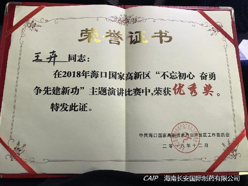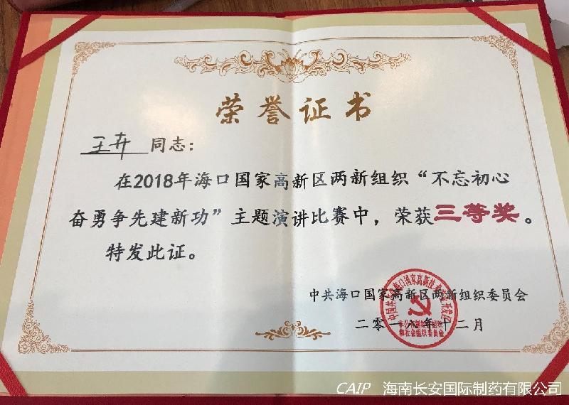 中共海南長安國際制藥有限公司黨支部積極響應高新區兩新組織黨委號召參加此次演講活動,并取得了三等獎及優秀獎的好成績。
