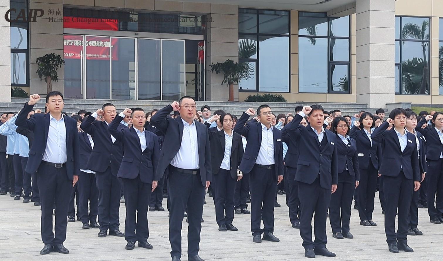 儀式啟幕,莊嚴肅穆。全體員工整齊列隊,精神抖擻。英姿颯爽的護旗手邁著鏗鏘有力的步伐走向升旗臺。在激昂的國歌聲中,鮮艷的五星紅旗緩緩升起,長安制藥全體員工莊嚴肅立,向國旗行注目禮,這一刻,國旗承載著全體員工對國家繁榮昌盛的美好祝愿,一同升起的司旗也象征著企業在新的一年里,為海南自由貿易港醫藥產業發展貢獻力量的堅定決心。