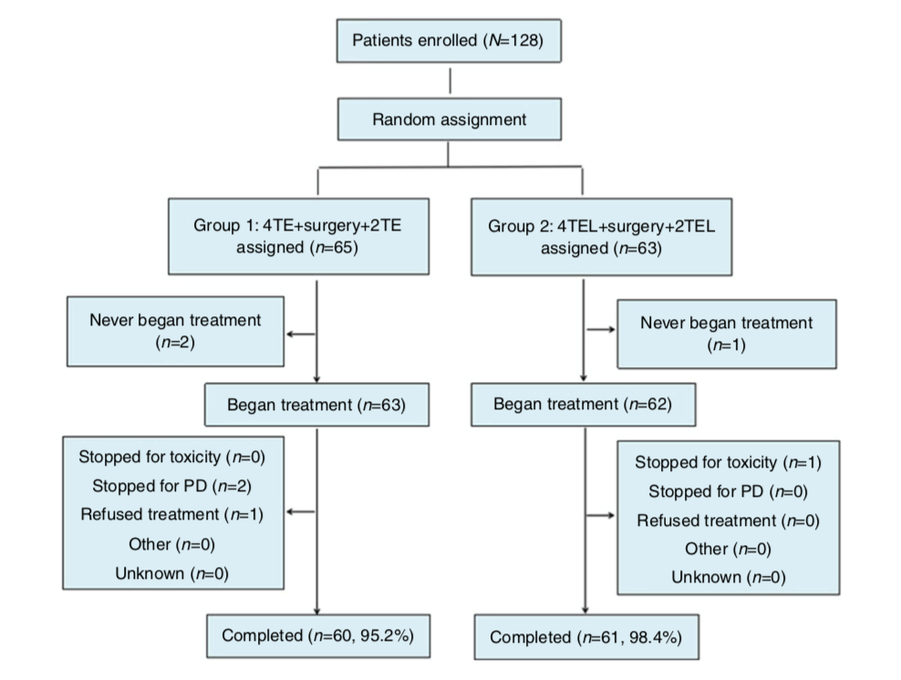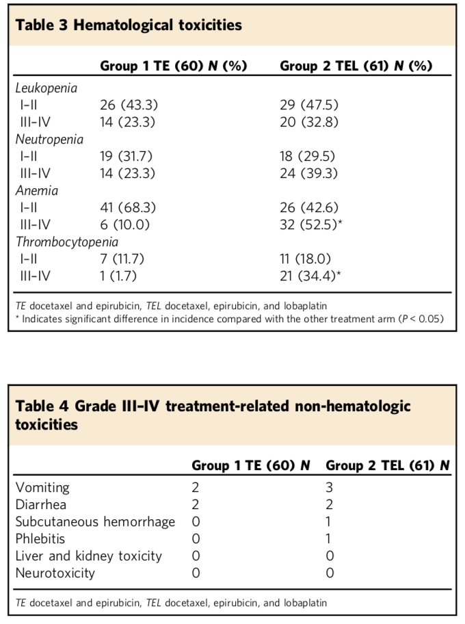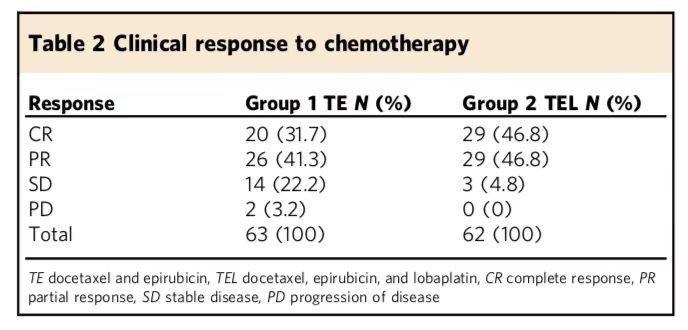 2、用藥方案:TE組63例,多西他賽 75mg/m2,表柔比星 80mg/m2, q21w,化療4個周期,手術,再化療2個周期 TEL組62例,多西他賽 75mg/m2,表柔比星 80mg/m2,洛鉑30mg/m2, q21w,化療4個周期,手術,再化療2個周期;